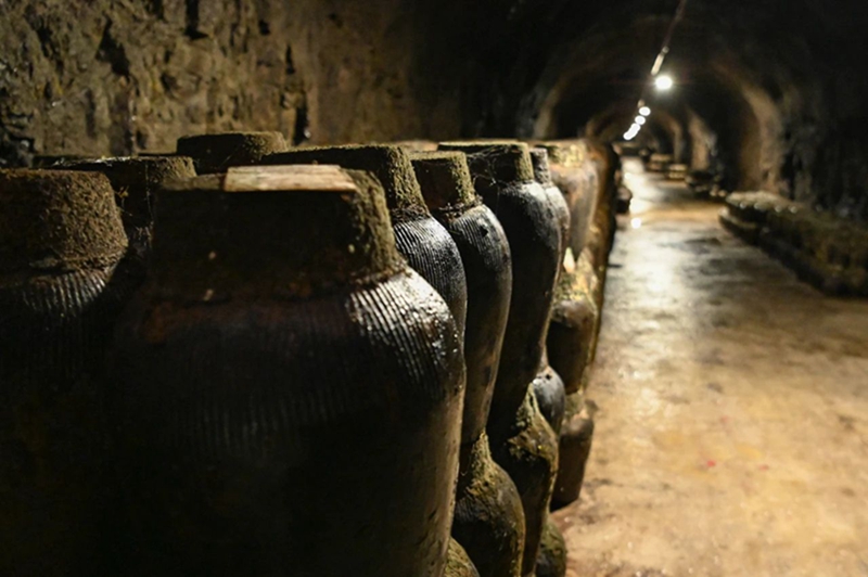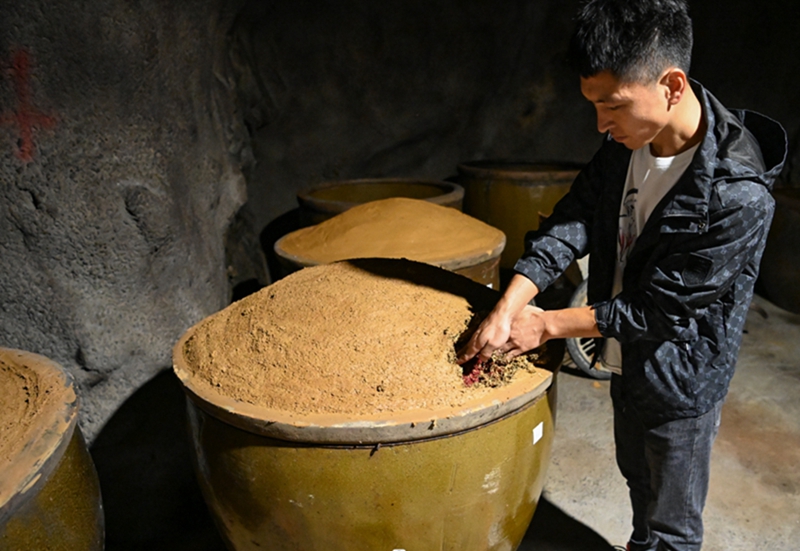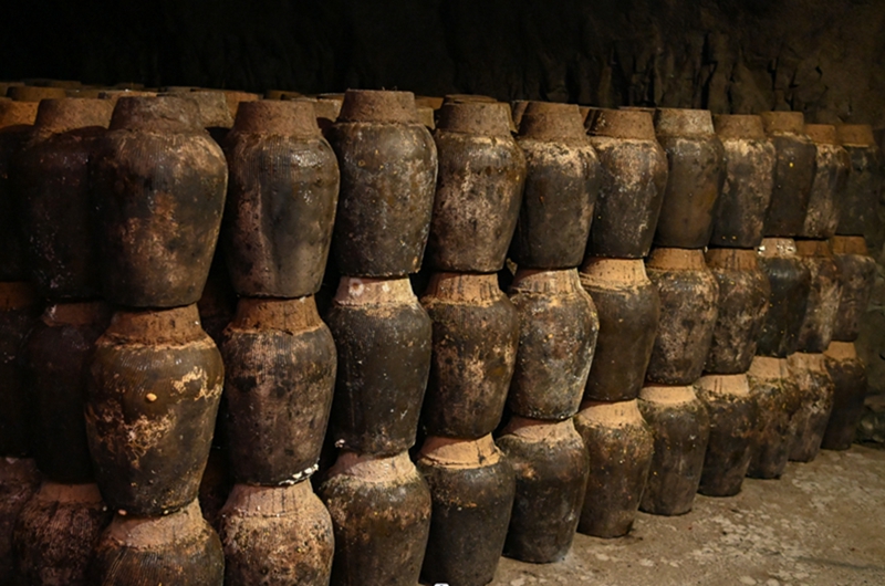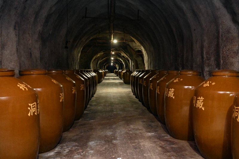 日前,记者来到洞藏酒窖,看到洞内3纵8橫,有19个藏酒窖区,一路走来酒香扑鼻。洞内一个个酒坛整齐排列,一层层往上叠,洞内每个储酒的陶罐封口都有年份标签,并记录在案。由于洞内常年保持恒温并有一定的温湿度,一些储存时间较长的藏酒窖区内酒坛长出了酿造益生菌。